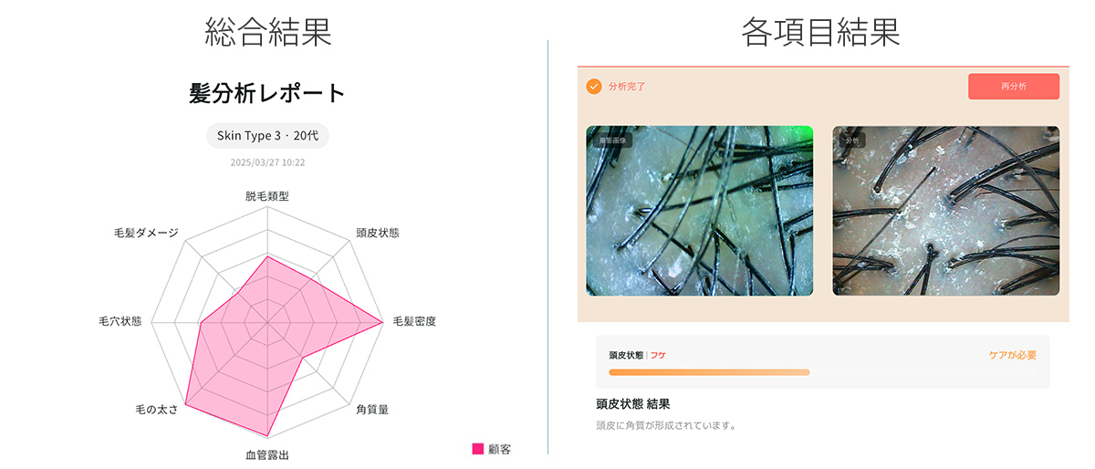 「脱毛類型」「頭皮状態」「毛髪密度」「角質量」「血管露出」「毛の太さ」「毛穴状態」「毛髪ダメージ」の8項目の結果をグラフで表示して頭皮や髪の状態をお知らせ。結果に合わせておすすめの商品を設定することが可能です。