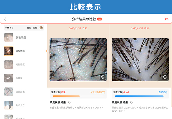 自分の頭皮の状態や改善状況などの変化を可視化することで、分析がお客さまのモチベーションに。次回の分析結果への期待感が再来店を促します。