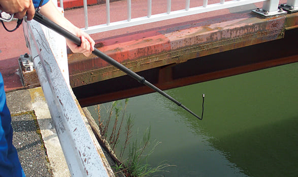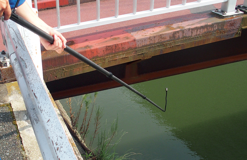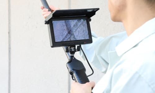 最長5.6mまで伸びる軽量ロングポールと、先端を自由に曲げられるフレキシブルチューブで、入り組んだ高所も地上からスムーズに点検。 7インチの大画面モニタが、点検箇所の様子をリアルタイムに映し出し、細かな異変も逃さずとらえます。 地上で点検作業が完結できるため、足場設置にかかっていた多大なコストと時間を大幅に削減。点検業務の安全性と効率を高めます。