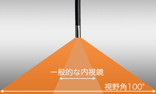 約100°の広い視野角により、一度の操作で広範囲を映し出すことができます。何度もカメラを動かす手間が省けるため、検査のスピードが向上します。