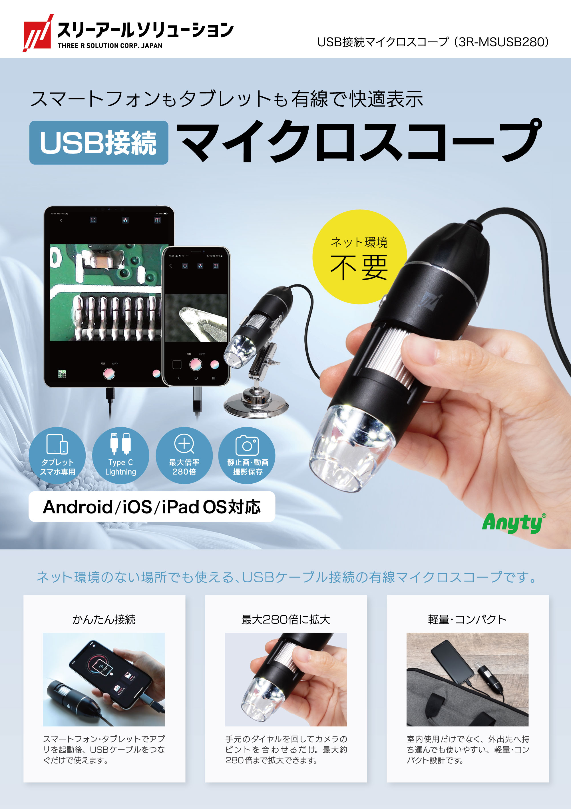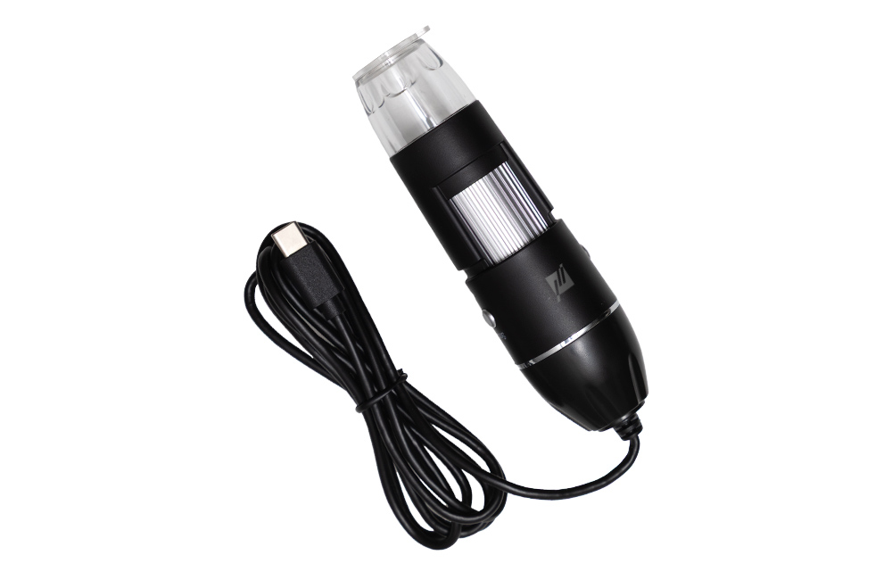 スマートフォンやタブレットにつなぐだけ。ネット環境のない場所でも使える、USBケーブル接続の有線マイクロスコープです。手元のダイヤルを回してカメラのピントを合わせるだけのシンプルな操作性で、最大約280倍まで拡大できます。室内使用だけでなく、外出先へ持ち運んでも使いやすい、軽量・コンパクト設計です。