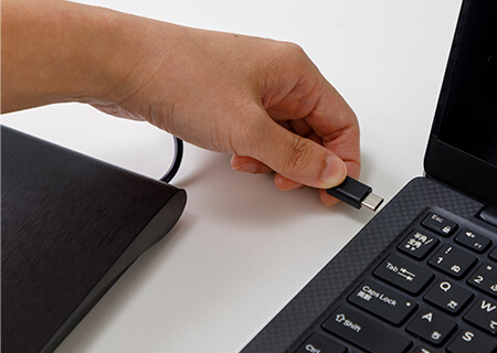 電源はパソコンのUSBポートから直接供給するバスパワー方式。コンセントやACアダプタなしで動作するため、電源が取れない場所でも、パソコンさえあればすぐに使えます。
