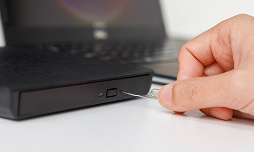 緊急取り出し穴(イジェクトホール)を搭載。トレイが正常に開かない場合でも、細い針金などを挿すことでディスクを物理的に取り出せます。